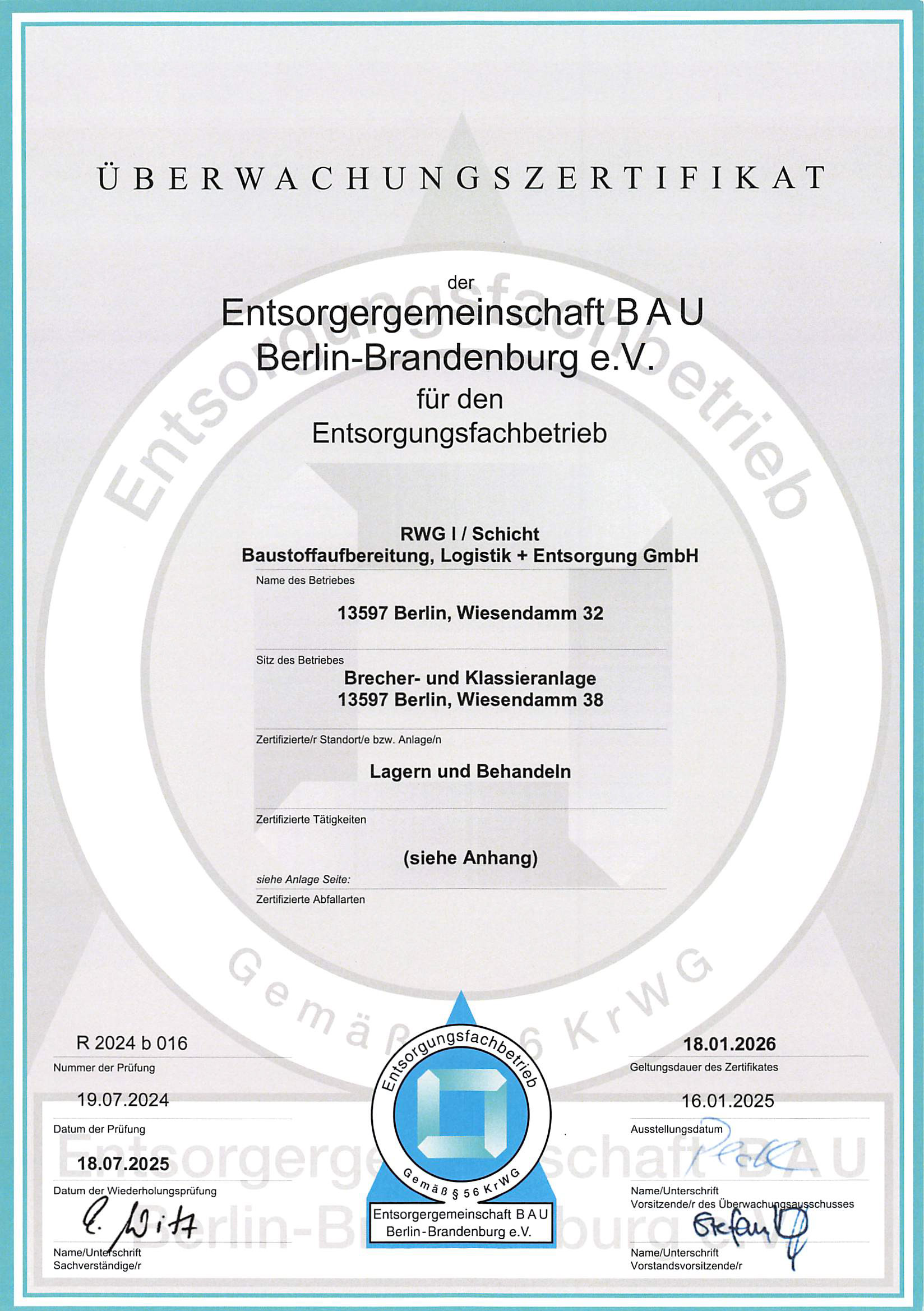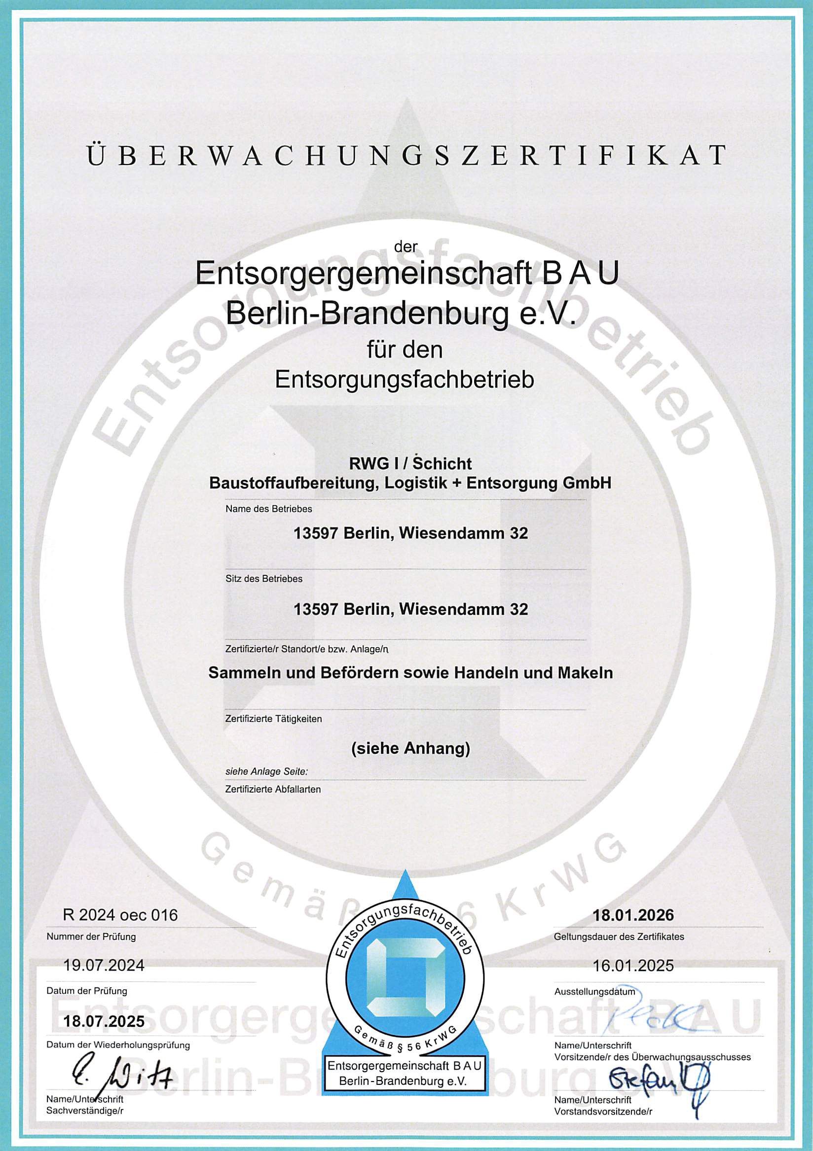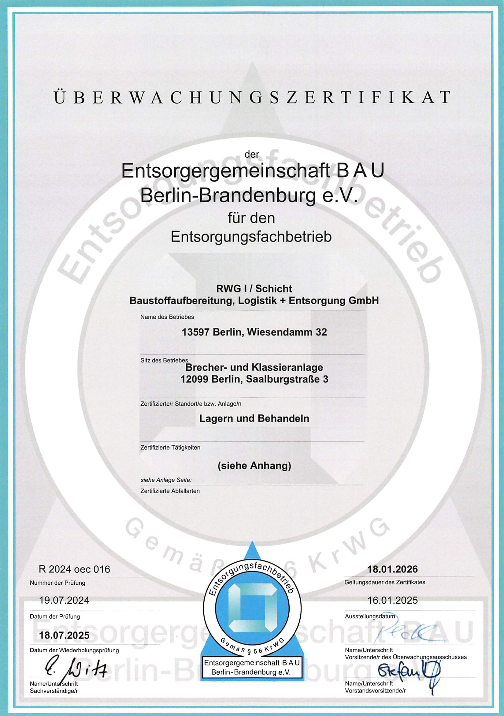 Wir verfügen über alle erforderlichen Genehmigungen und Zertifikate für den Betrieb unserer Anlagen sowie Transport, Lagerung und Behandlung von Bauabfällen.