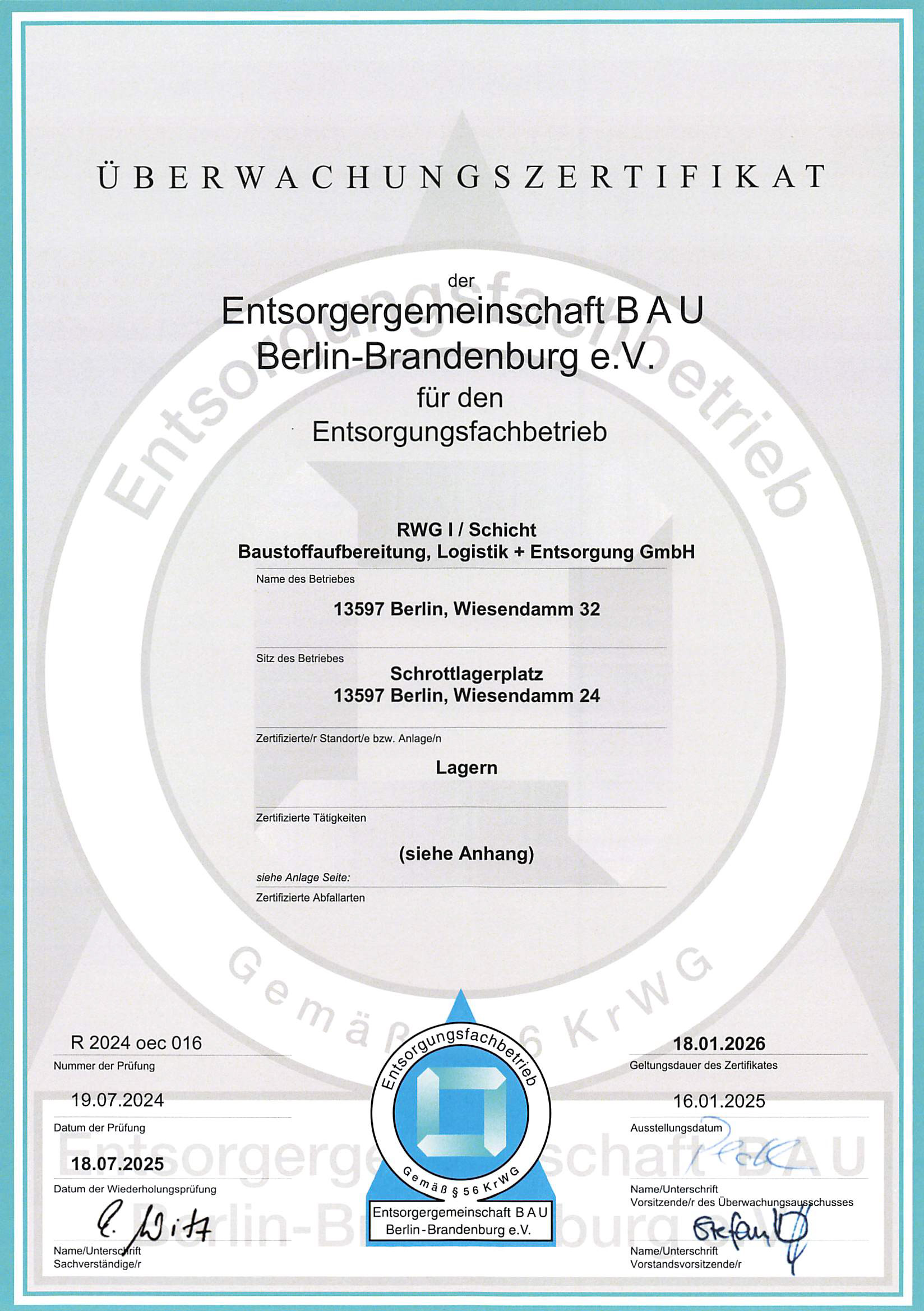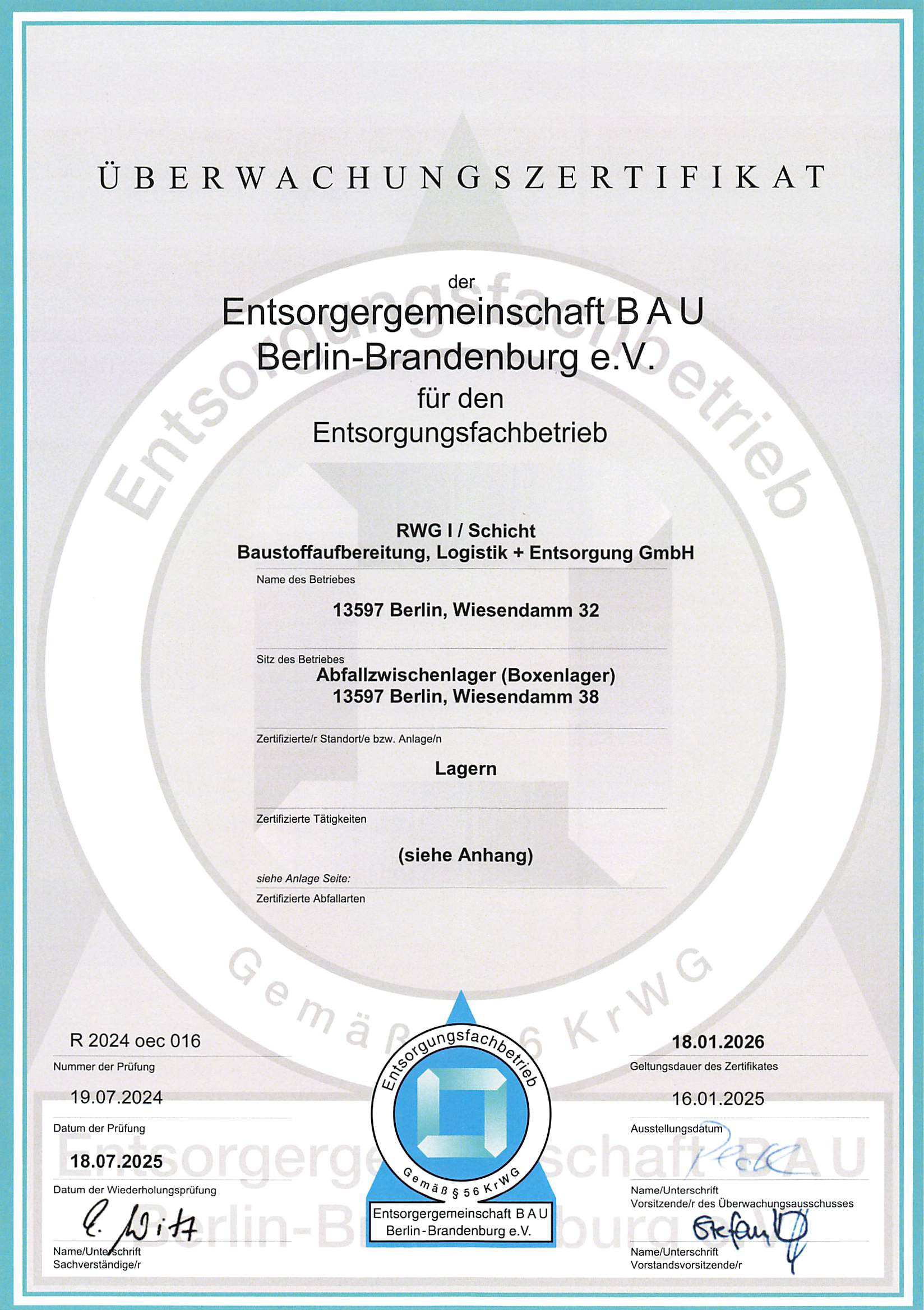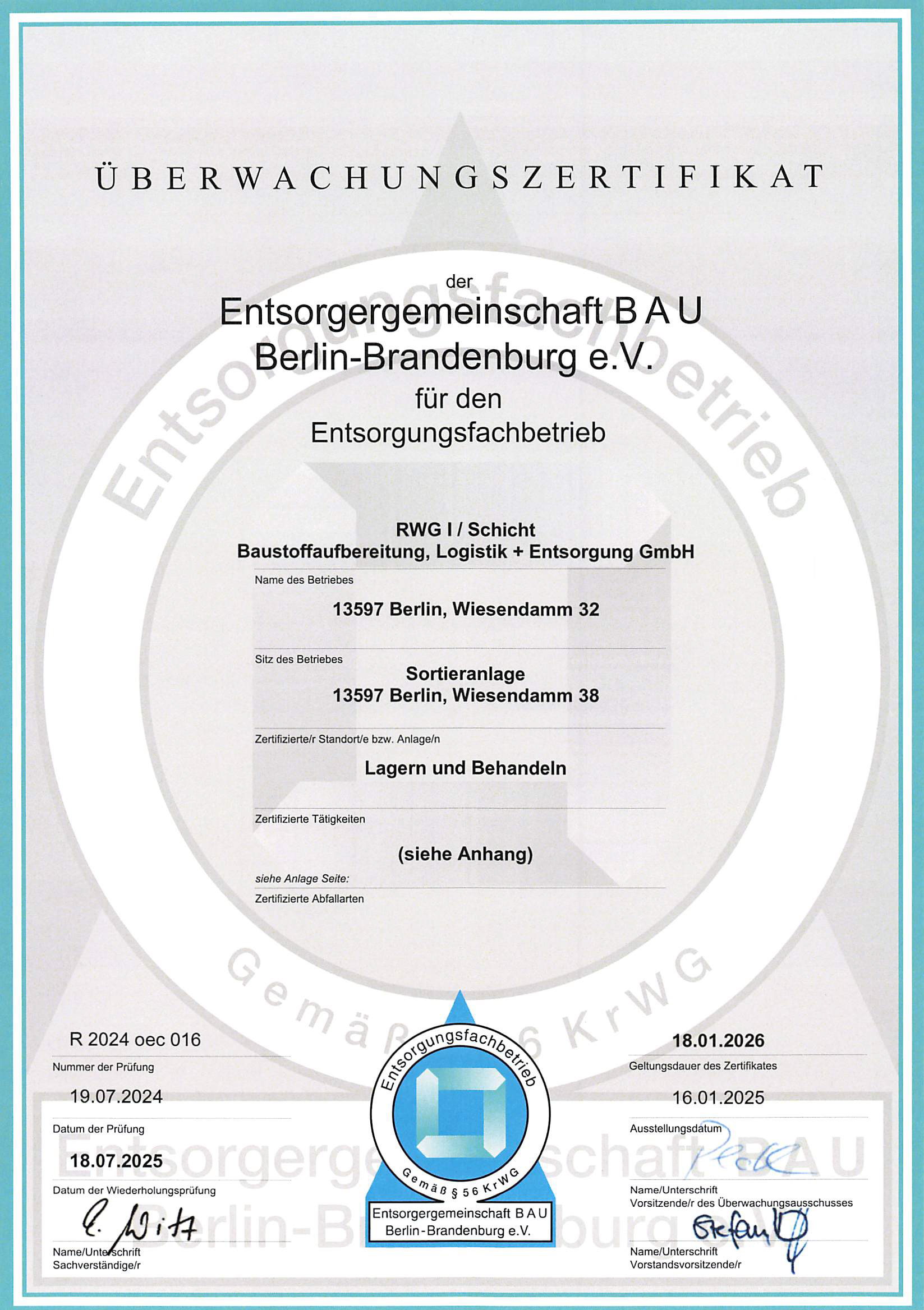 Wir verfügen über alle erforderlichen Genehmigungen und Zertifikate für den Betrieb unserer Anlagen sowie Transport, Lagerung und Behandlung von Bauabfällen.